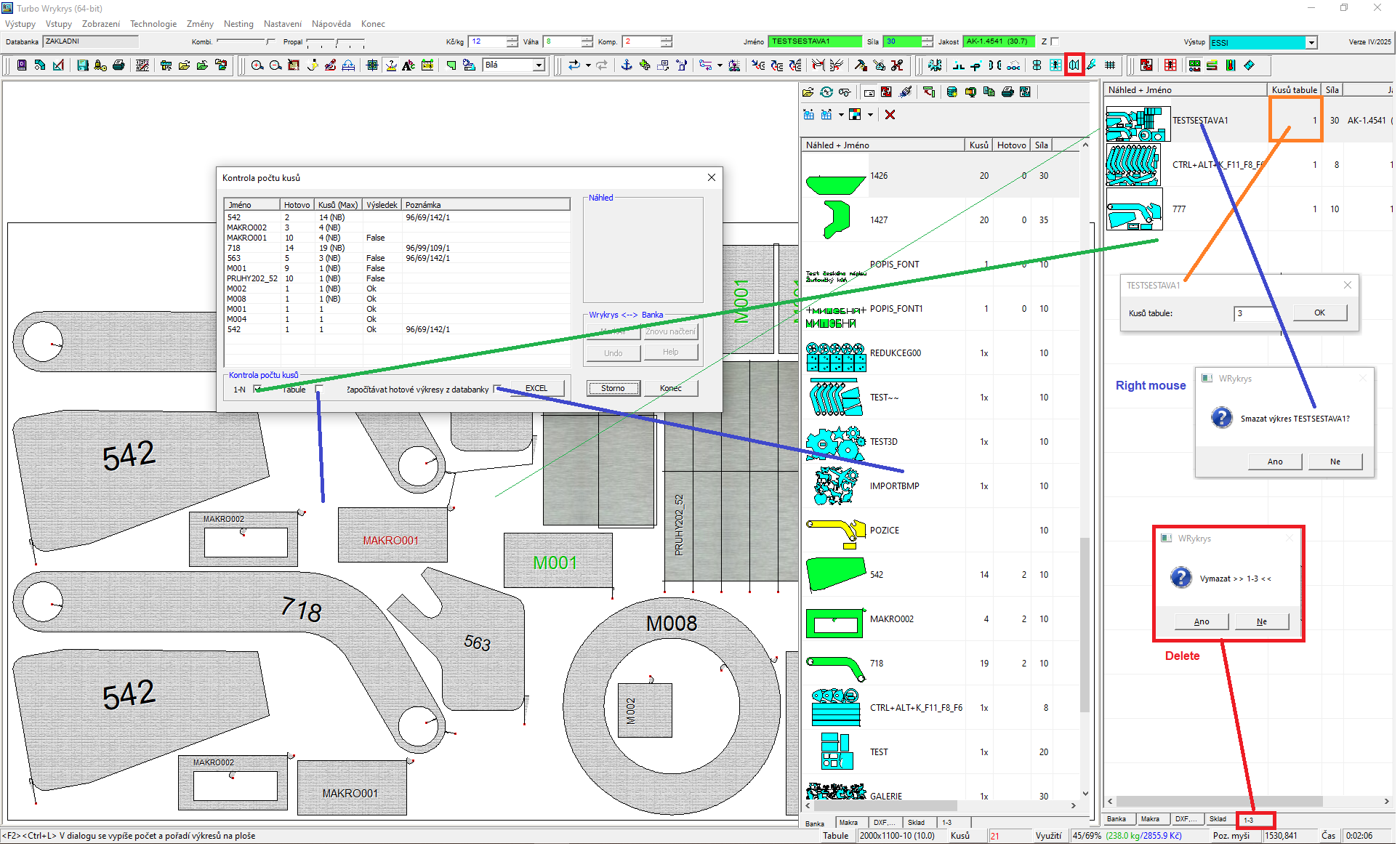 1. Every drawing, macro as well as DXF drawing is saved to databank. The databank stores quantity of finished and total number of pieces. Wrykrys calls for the saving to databank with the help of saving dialogue. Quantity of pieces in the dialogue is distinguished by color.